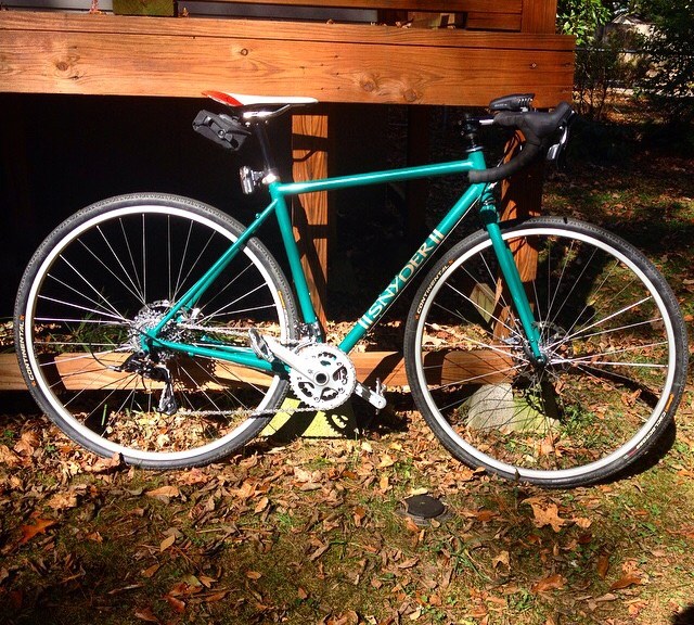 The bike is built with SRAM Apex and TRP Spyre mechanical disc brakes. The cranks are Sugino OX601s geared at 26/40 with an 11-32 cassette for a nice low-end range. The wheels are CR18s with Shimano SLX hubs and 32 spokes laced 3 cross rear and 2 cross front.